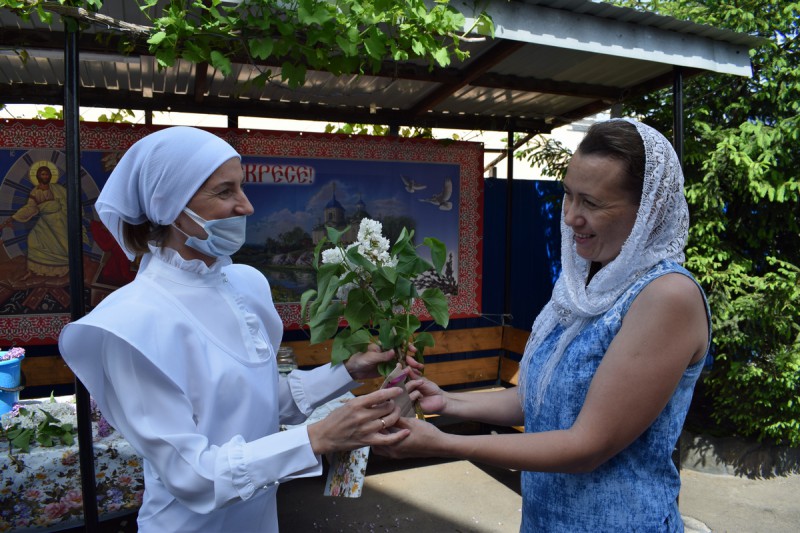 В день памяти святых Жен – мироносиц, сестры милосердия Марфо–Мариинского Сестричества поздравили всех женщин - прихожанок храма Архистратига Михаила п. Каменоломни Октябрьского района с праздником, подарив каждой букет цветов и памятный подарок.