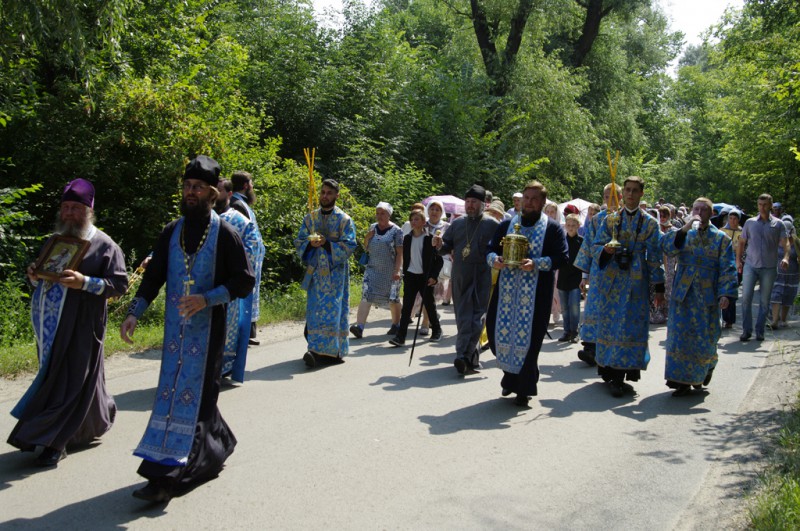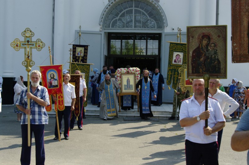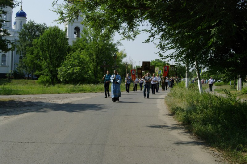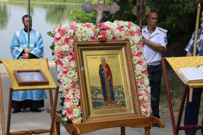 Крестный ход начал свое движение от Успенского храма Донецкого Успенского архиерейского подворья ст. Гундоровской. Епископ Шахтинский и Миллеровский Симон, духовенство епархии и прихожане храмов Донецкого благочиния, совершив молитву перед святынями – иконой с частицей мощей святого равноапостольного князя Владимира, иконой с частицей мощей святого князя Александра Невского и мощевиком с частицей мощей святой блаженной Матроны Московской, отправились пешим ходом до паромной переправы города Донецка.