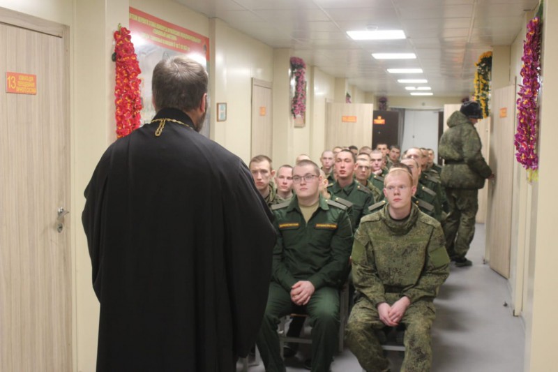 Настоятель храма святого великомученика Георгия Победоносца посёлка Новозарянский Октябрьского района Нижнедонского благочиния иерей Сергий Липень с пастерским визитом посетил военнослужащих 163 танкового полка, расположенного в посёлоке Персиановский Октябрьского района.