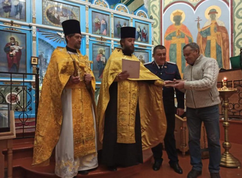 Благочинный приходов Нижнедонского округа протоиерей Сергий Яценко наградил Благодарственным письмом от Нижнедонского благочиния, уроженца и коренного жителя станицы Бессергеневской, Донского казака Черемисова Павла Ивановича за духовно - нравственное просвещение жителей Октябрьского района и сохрание истории родного края.