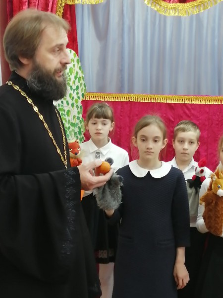Отец Сергий рассказал о празднике Пасхи Господней, о Пасхальных традициях и подарил ребятам иконы.