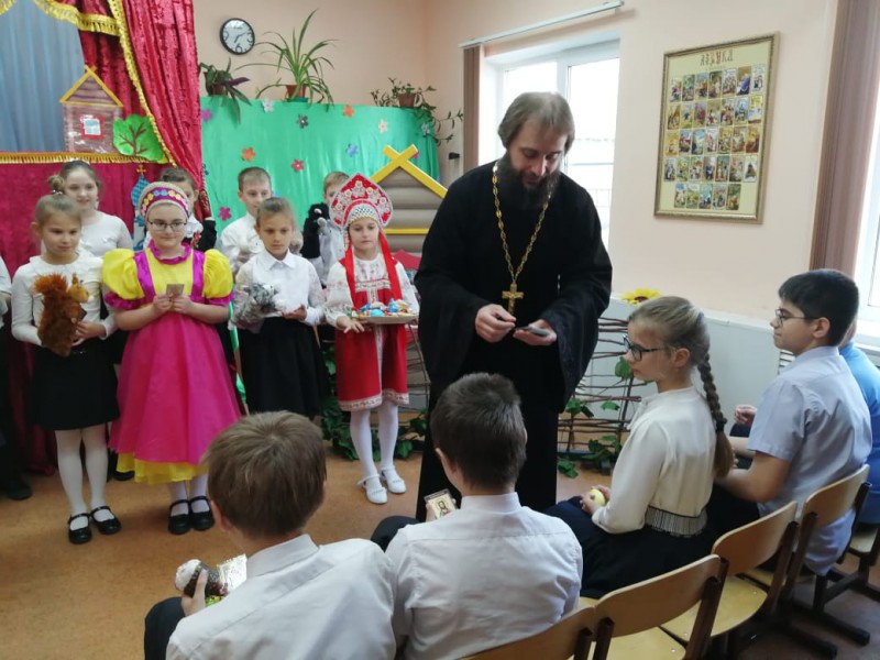 На Светлой Седмице, благочинный приходов Нижнедонского округа протоиерей Сергий Яценко посетил школу № 23 п. Красногорняцкий Октябрьского района и поздравил учащихся с великим праздником Пасхи.