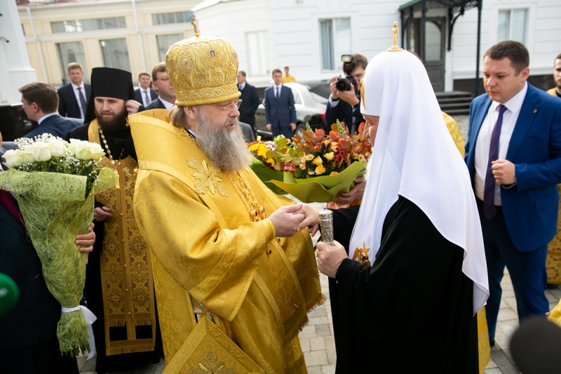 По окончании Литургии митрополит Ростовский и Новочеркасский Меркурий приветствовал Святейшего Владыку и преподнес Его Святейшеству специально написанный ко дню освящения собора Донской образ Божией Матери с предстоящим святителем Димитрием Ростовским и изображением обновленного кафедрального собора г. Ростова-на-Дону.