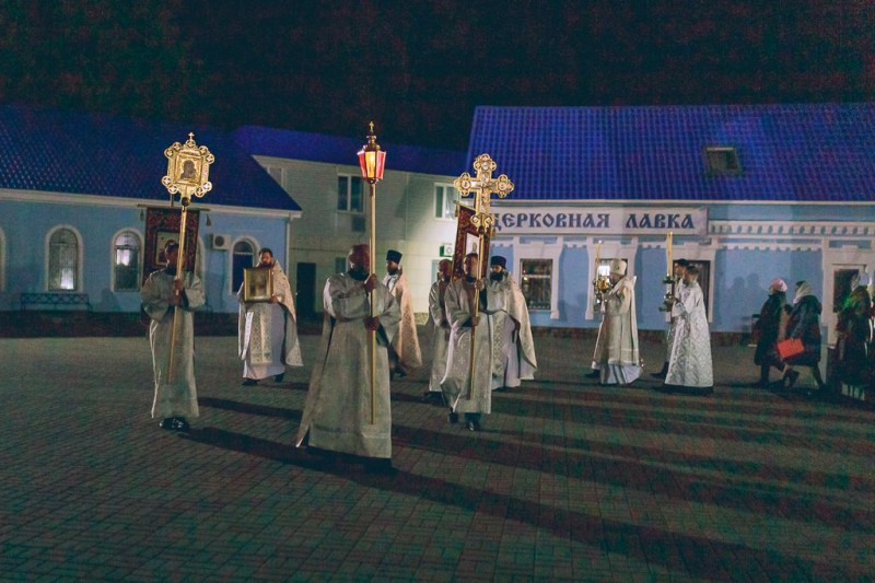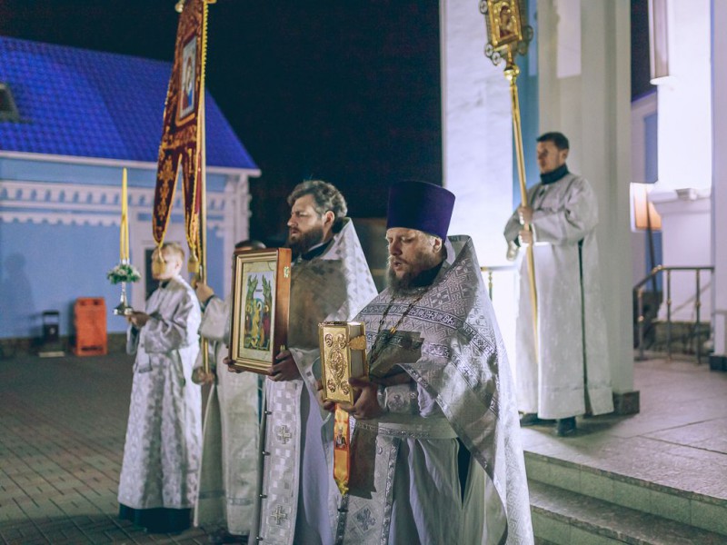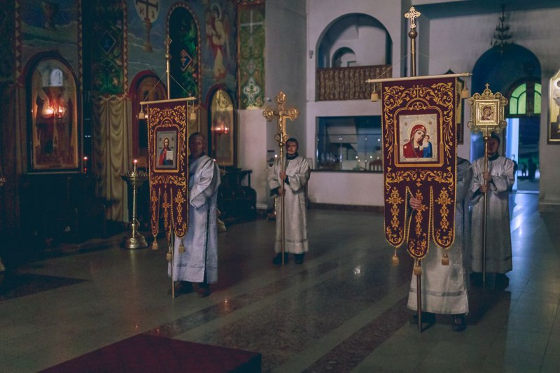 Все богослужение этого праздника проникнуто чувством радости о Воскресшем Христе. До полуночи священнослужители облачаются во весь светлейший сан. Перед самой полуночью торжественный колокольный благовест возвещает о наступлении Светоносного Праздника Воскресения Христова. Священнослужители с крестом, светильниками и каждением исходят из алтаря и обходят вокруг собора с пением «Воскресение Твое, Христе Спасе, Ангели поют на небесех, и нас на земли сподоби чистым сердцем Тебе славити». Шествие останавливается у затворенных западных врат храма, и здесь впервые архиерей возглашает радостную песнь: «Христос воскресе из мертвых, смертию смерть поправ, и сущим во гробех живот даровав».