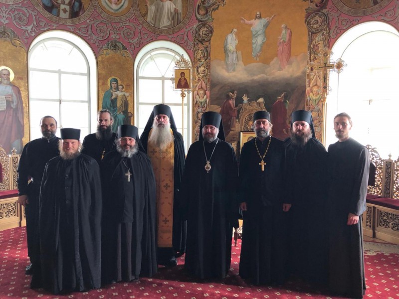 Его Преосвященству сослужила братия монастыря в священном сане.
