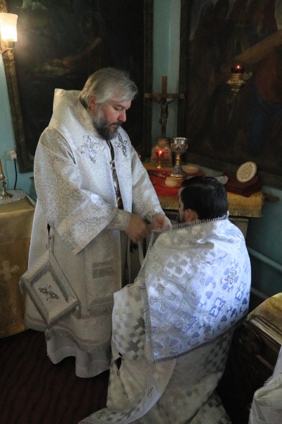 Его Преосвященству сослужили благочинный приходов Александровск-Грушевского округа протоиерей Сергий Яценко, благочинный приходов Донецкого округа иерей Владимир Татаркин, клирик храма святителя Николая иерей Николай Налеткин, настоятель храма Успения Пресвятой Богородицы ст. Калитвенской иерей Игорь Лосев, диакон Даниил Зырянов и диакон Трофим Осяк.