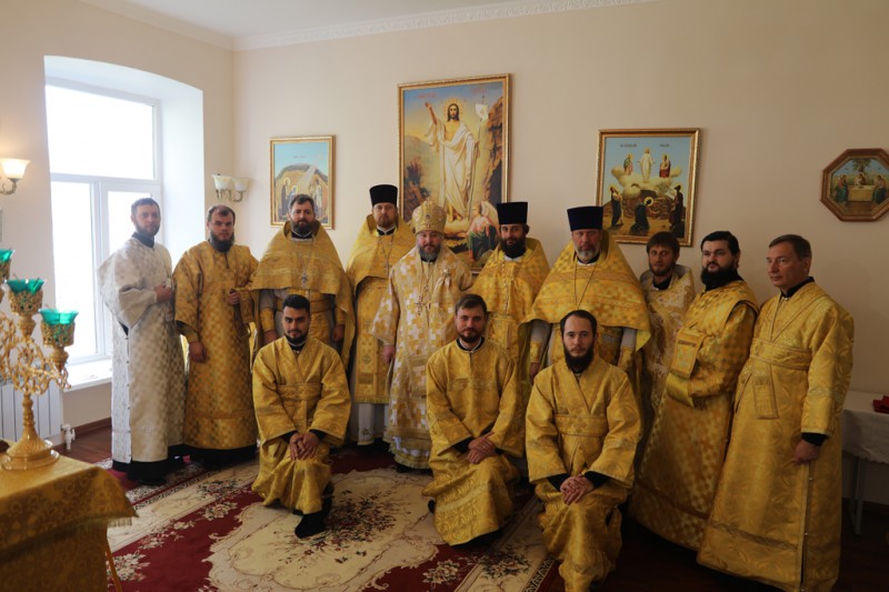 За праздничным богослужением архипастырю сослужили председатель епархиального отдела образования Шахтинской епархии протоиерей Сергий Яценко; настоятель храма при институте, старший преподаватель кафедры протоиерей Роман Амплеев; заведующий кафедры «Православная культура и теология» иерей Владислав Касьянов; клирик храма великомученицы Екатерины г. Красный Сулин иерей Георгий Кофанов; настоятель храма праведного Иоанна Кронштадтского г. Шахты иерей Алексий Скосарев, клирики Покровского кафедрального собора г. Шахты диакон Трофим Осяк и диакон Никита Осипов.