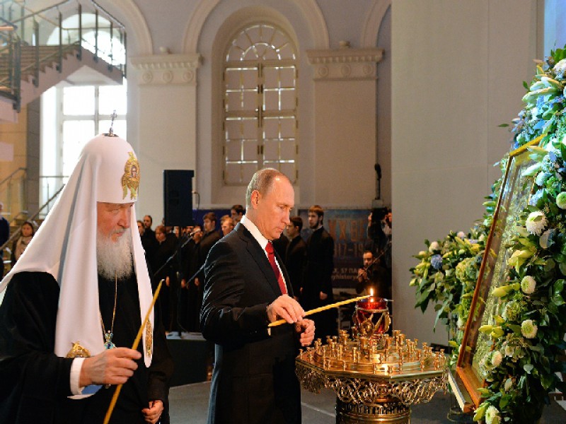 В центральный зал Манежа на время проведения выставки принесен список Владимирской иконы Божией Матери. Глава государства и Предстоятель Русской Православной Церкви поставили свечи у чудотворного образа и поклонились святыне.