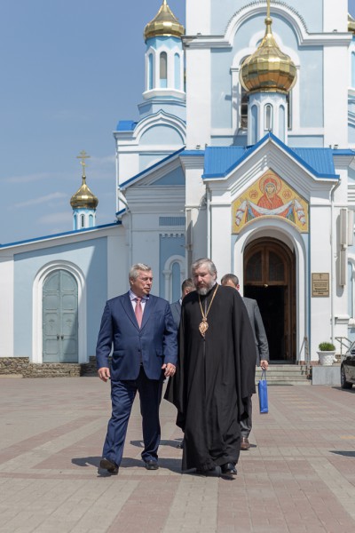 Далее общение продолжилось в Епархиальном управлении, где Василий Юрьевич, Андрей Владимирович и епископ Симон обсудили те вопросы, в рамках которых может осуществляться церковно-государственное взаимодействие: социальная сфера, помощь беженцам Донбасса, окормление постояльцев медучреждений и духовно-нравственное воспитание.