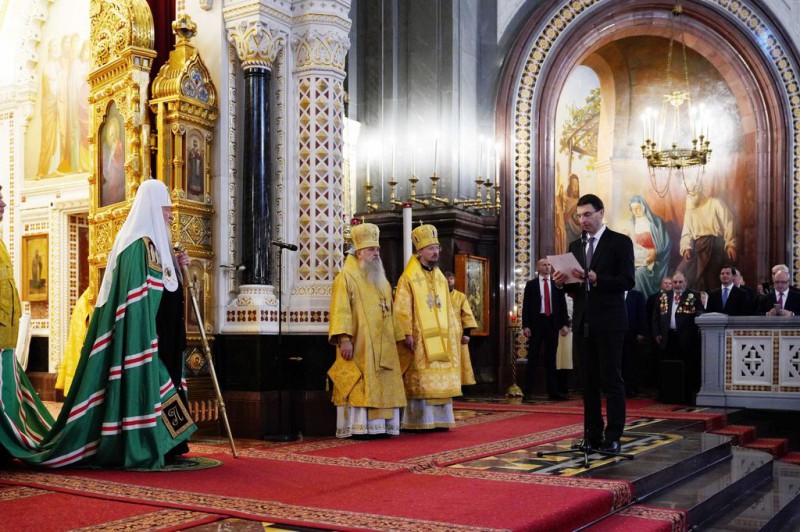 Полномочный представитель Президента РФ в Центральном федеральном округе И.О. Щеголев огласил поздравление Президента России В.В. Путина Предстоятелю Русской Православной Церкви.