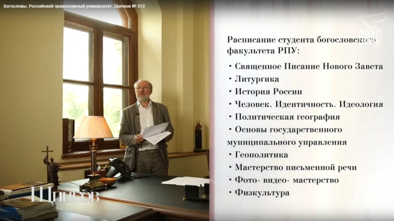 Александр Щипков рассказывает о целях и принципах обучения на Богословском факультете Российского православного университета святого Иоанна Богослова. Ректор РПУ сделал вывод, что Российский православный университет отличался от семинарий тем, что на семинарах готовят священнослужителей, а в РПУ готовят мирян, которые работают в Синодальных и епархиальных учреждениях Русской Православной Церкви, а также в системе государственного управления, в средствах массовой информации и т. д. д. При этом главная задача РПУ – подготовка кадров для Русской Церкви.