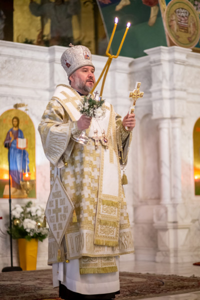 Богослужение завершилось славлением перед праздничной иконой, после которого архиерей поздравил духовенство и верующих с праздником.