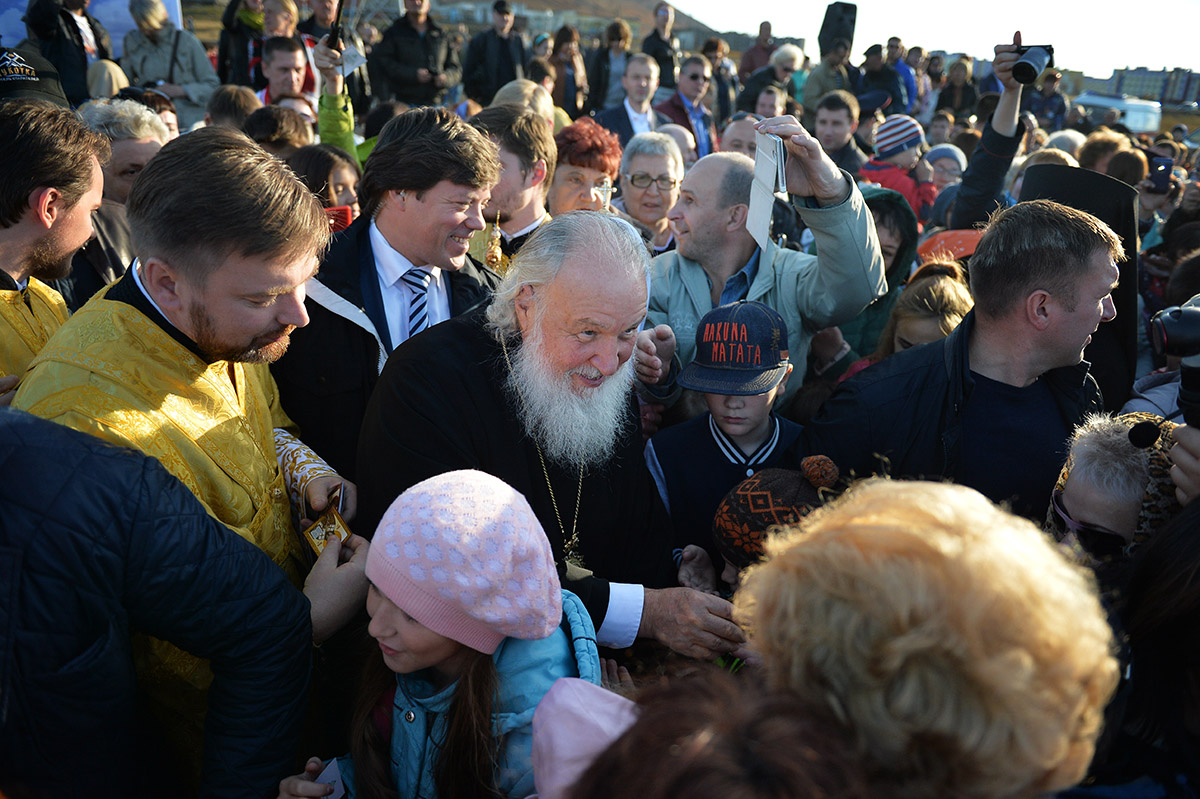 «Роман Валентинович, губернатор Чукотской земли! Дорогие отцы, братья и сестры! Еще раз всех вас сердечно приветствую и поздравляю с очень большим событием. Города на Руси — и самые значительные, как Москва или Петербург, и прочие — всегда начинались со строительства храма. Люди, возводившие храм, понимали, что над этим местом пребудет Божие благословение, потому что именно в храме мы входим в соприкосновение с Богом. Мы просим Его, мы молимся Ему с верой, и Он отвечает нам — не в громе и молнии, не в событиях, потрясающих воображение, а как бы в легком прикосновении ветра к нашей душе, к нашему разуму. Человек чувствует, что постепенно становится другим. Наши благочестивые предки, строя города, знали, что им придется столкнуться со многими трудностями, а стало быть, нужно откуда-то черпать силу, — и они черпали ее в молитве, которая пробуждала у них любовь к Богу, уважение к друг другу, взаимную поддержку и солидарность.