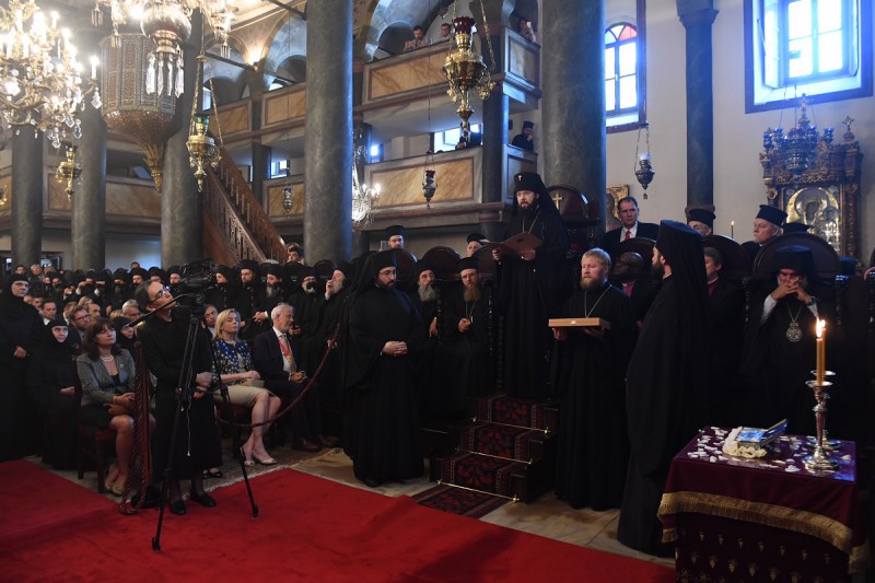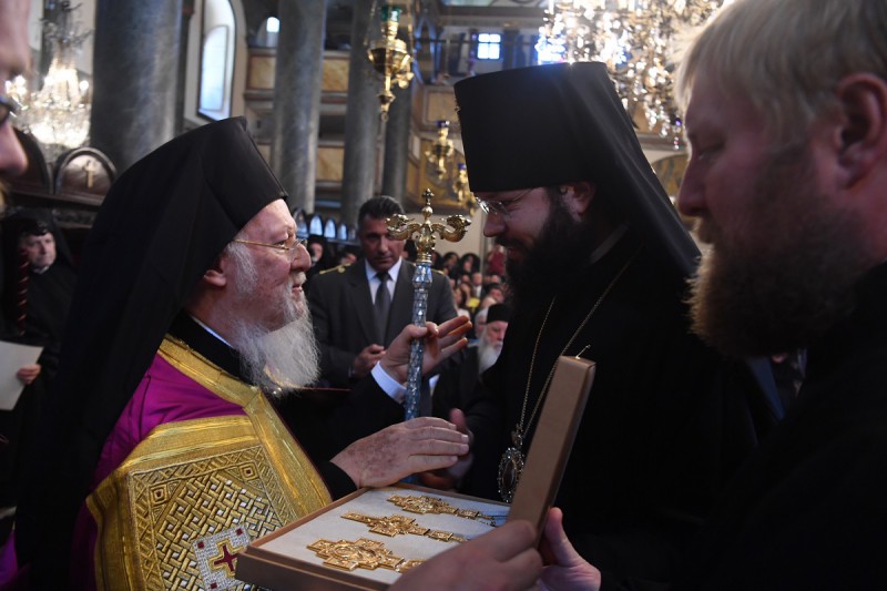 По отпусте богослужения архиепископ Антоний огласил поздравительный адрес Святейшего Патриарха Московского и всея Руси Кирилла и вручил Святейшему Патриарху Варфоломею в дар от Предстоятеля Русской Православной Церкви знаки Патриаршего достоинства — святые панагии и крест.