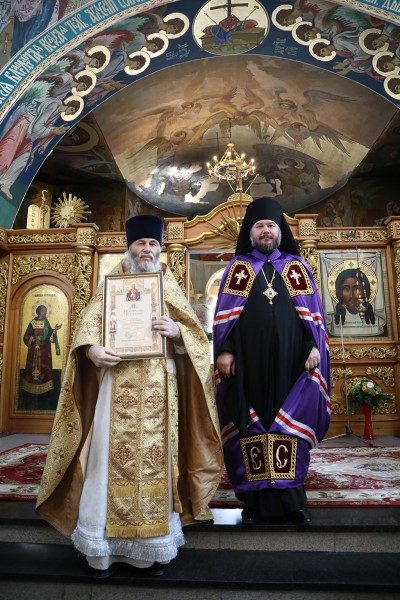 По благословению Святейшего Патриарха Московского и всея Руси Кирилла во внимание к усердным трудам во благо Святой Церкви и в честь 50-летия со дня рождения Преосвященнейший епископ Симон вручил Патриаршую грамоту наместнику Покровского Верхнемакеевского мужского монастыря игумену Алиму (Неживову), во внимание к усердным трудам во благо Святой Церкви и в честь 30-летия служения в сане – настоятелю Кресто-Воздвиженского храма хут. Астахов протоиерею Иоанну Елатонцеву, медаль «100-летие восстановления Патриаршества в Русской Православной Церкви» – благочинному приходов Багаевского округа протоиерею Александру Маштанову.