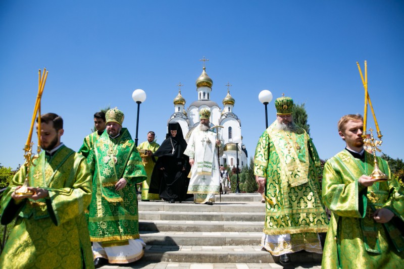17 июня 2019 года, в День Святого Духа, в Троицком храме Свято-Иверского женского монастыря Ростова-на-Дону Божественную литургию совершили митрополит Ростовский и Новочеркасский Меркурий, епископ Волгодонский и Сальский Корнилий, епископ Шахтинский и Миллеровский Симон.