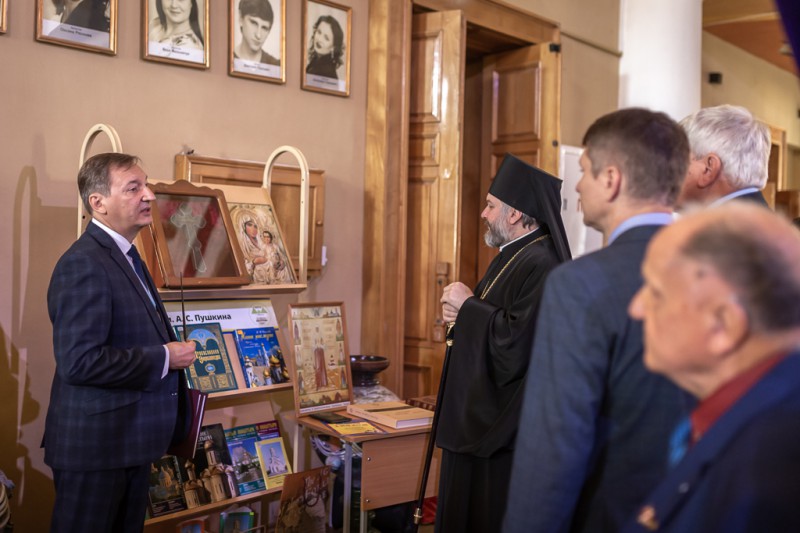 Главными святынями выставки стали аналойный кипарисовый живописный крест палестинской работы с частицей Древа Креста Господня и мироточивая храмовая икона Божией Матери Иверской, написанная инокописцами святой Афонской Горы в XIX веке, доставленая из храма святителя Алексия, митрополита Московского станицы Бессергеневская Октябрьского района.