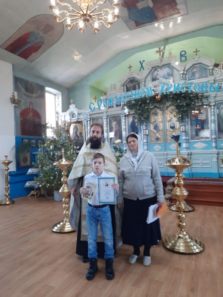В святочные дни, благочинный приходов Нижнедонского округа протоиерей Сергий Яценко наградил учащихся церковно - приходской воскресной школы "Благовест" храма Архистратига Михаила п. Каменоломни Октябрьского района за участие в детских районных, областных и епархиальных художественных конкурсах и вручил дипломы.