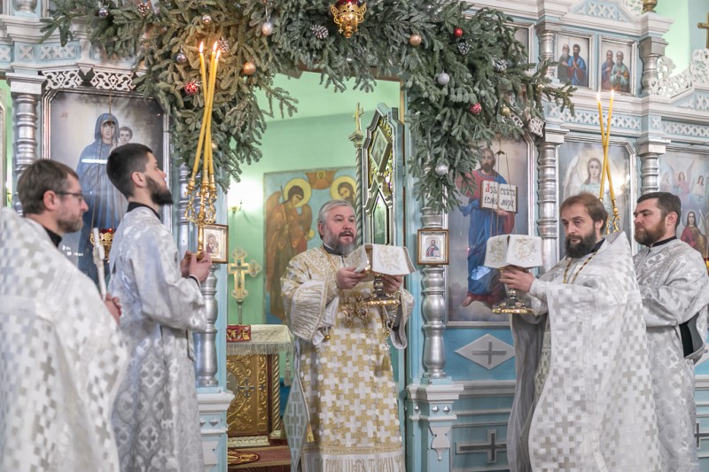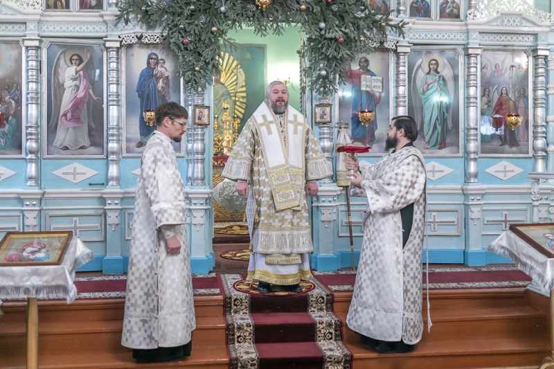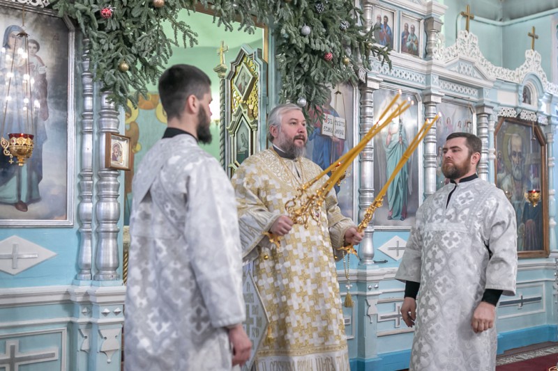 Его Преосвященству сослужили благочинный приходов Нижнедонского округа, настоятель храма протоиерей Сергий Яценко, клирик Вознесенского храма г. Шахты иерей Виталий Крендясов, клирик храма Архистратига Михаила диакон Максим Коваленко и клирик Покровского кафедрального собора г. Шахты диакон Трофим Осяк.