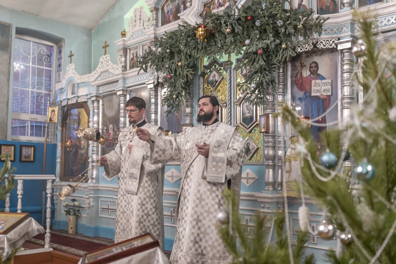 Его Преосвященству сослужили благочинный приходов Нижнедонского округа, настоятель храма протоиерей Сергий Яценко, клирик Вознесенского храма г. Шахты иерей Виталий Крендясов, клирик храма Архистратига Михаила диакон Максим Коваленко и клирик Покровского кафедрального собора г. Шахты диакон Трофим Осяк.