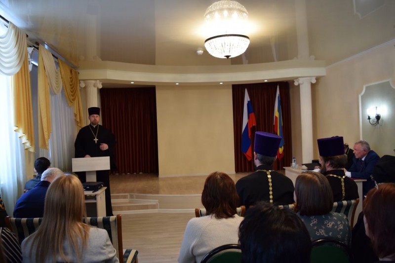 С приветственным словом перед собравшимися выступил председатель оргкомитета протоиерей Роман Амплеев, благочинный приходов Новошахтинского округа, который обратился к собравшимся и зачитал послание Святейшего Патриарха Московского и всея Руси Кирилла по случаю празднования Дня православной молодежи, представил почетных гостей и предоставил слово председателю городской Думы – главе города Новошахтинска Юрию Владимировичу Ушаневу. Глава, обратившись с приветственным словом к присутствующим, поздравил участников конференции с великим праздником Сретения Господня и Днем православной Молодежи, а также поблагодарил всех за значительный вклад в воспитание молодежи Новошахтинска. Юрий Владимирович вручил благодарственные письма протоиерею Роману Амплееву и директору филиала ЮФУ в г. Новошахтинске Н.Н. Вакула.
