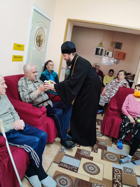 В день Великого праздника- Воскресения Христова, благочинный приходов Нижнедонского округа протоиерей Сергий Яценко, учащиеся церковно - приходской воскресной школы "Благовест" и сестры милосердия Марфо-Мариинского сестричества храма Архистратига Михаила п. Каменоломни Октябрьского района поздравили постояльцев Центра социального обслуживания граждан пожилого возраста и инвалидов с пасхальным торжеством.
