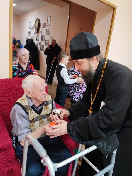 В день Великого праздника- Воскресения Христова, благочинный приходов Нижнедонского округа протоиерей Сергий Яценко, учащиеся церковно - приходской воскресной школы "Благовест" и сестры милосердия Марфо-Мариинского сестричества храма Архистратига Михаила п. Каменоломни Октябрьского района поздравили постояльцев Центра социального обслуживания граждан пожилого возраста и инвалидов с пасхальным торжеством.
