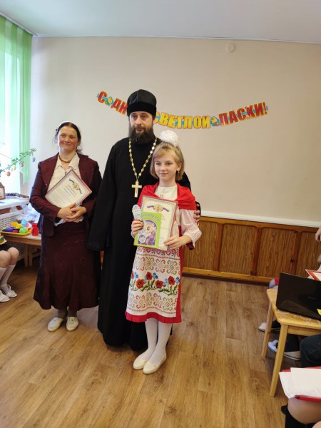 Священник рассказал детям о значении «праздника праздников» Воскресения Христа, наградил детей дипломами за активное мероприятие в конкурсе декаротивно - прикладного творчества "Пасхальное яйцо" и подарил ребятам подарки, пасхальные куличи и паски. Учащиеся воскресной школы показали воспитанникам праздничный концерт.