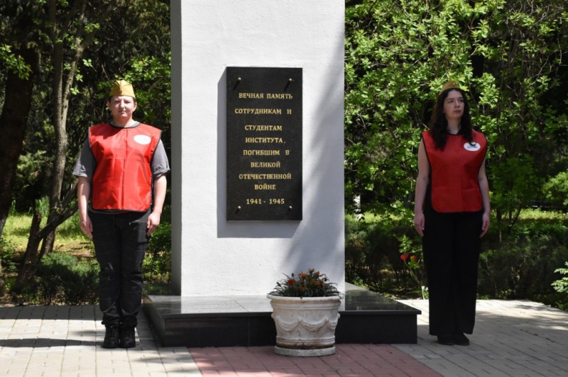 Собравшиеся почтили память павших минутой молчания и возложили цветы к памятнику студентам и сотрудникам вуза, отдавшим свою жизнь в боях за Родину. Право первыми возложить цветы к монументу было предоставлено руководителям патриотических объединений вуза.