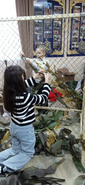 Сестры Марфо - Мариинского Сестричества, молодёжный актив семейного клуба "Верность" и воспитанники старшей группы церковно - приходской воскресной школы "Благовест" храма Архистратига Михаила п. Каменоломни совместно с учителями и родителями в свое свободное время собираются в мастерскую и совместно с волонтёрами района плетут маскировочные сети.