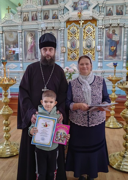 Настоятель храма, благочинный приходов Нижнедонского округа протоиерей Сергий Яценко, поздравил учащихся воскресной школы и воспитанников социального приюта для детей и подростков Октябрьского района "Огонек", активно принявших участие в конкурсе, подарил каждому ребёнку подарок и пожелал дальнейших творческих успехов.