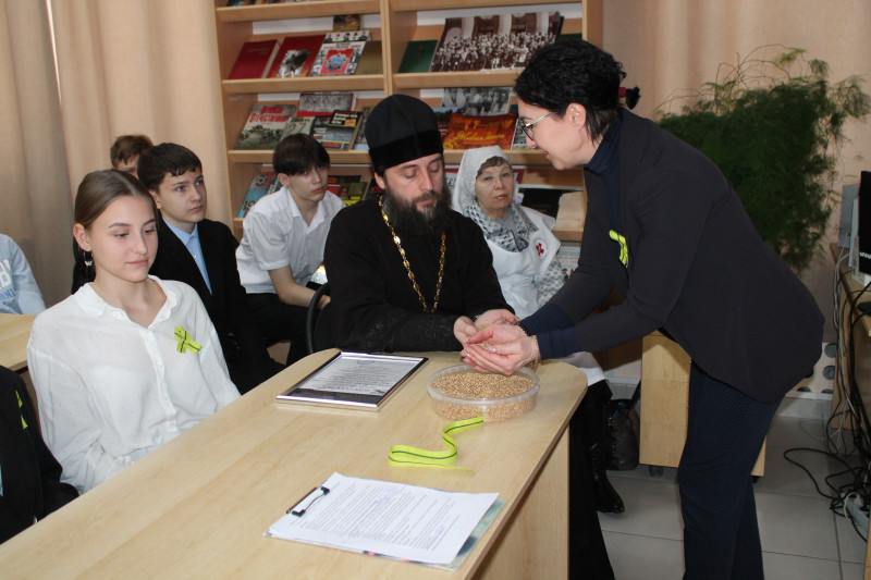 Благочинный приходов Нижнедонского округа протоиерей Сергий Яценко, рассказал ребятам о церковной жизни блокадного города и том, какой значимый вклад внесли священнослужители и церковнослужители в дело общей великой победы.