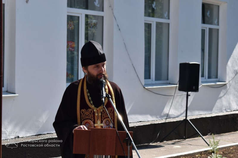 Благочинный приходов Нижнедонского округа протоиерей Сергий Яценко совершил освящение мемориальной доски и обратился к участникам с пастырским словом.