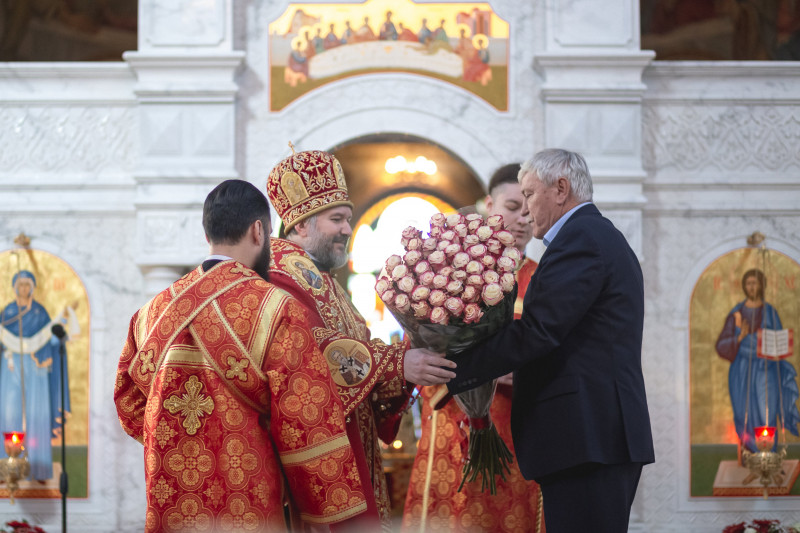 Владыку Симона, духовенство и всех собравшихся на молитву с праздником Светлого Христова Воскресения поздравил заместитель председателя Законодательного Собрания Ростовской области Вячеслав Николаевич Василенко.