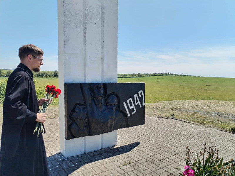 После совершения заупокойного Богослужения, на котором были вознесены молитвы о "приснопамятных вождях и воинах за веру и Отечество на поле брани жизнь свою положивших, от ран и глада скончавшихся, в пленении и горьких работах невинно умученных и убиенных, и всех, Победы ради потрудившимся", благочинный приходов Нижнедонского протоиерей Сергий Яценко и клирик храма Архистратига Михаила п. Каменоломни иерей Максим Коваленко почтили память погибших в годы Великой Отечественной войны, возложили цветы к месту убитым и расстрелянным жителям п. Каменоломни и г. Шахты в период оккупации 1942 г. и братской могиле солдат в п. Каменоломни, умерших от ран в санитарных поездах.