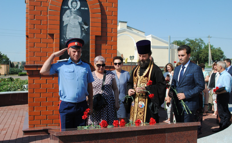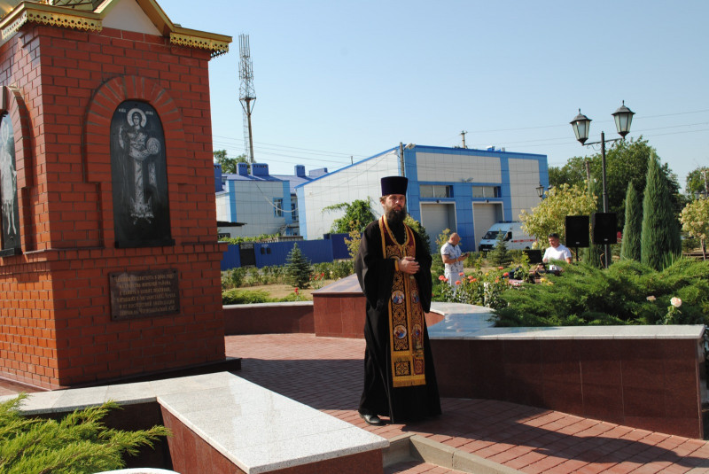 Благочинный приходов Нижнедонского округа протоиерей Сергий Яценко совершил панихиду по усопшим воинам, в годы военных конфликтов смерть принявших, после чего участники мероприятия почтили память погибших минутой молчания и возложили венки и живые цветы к мемориалу погибших героев.
