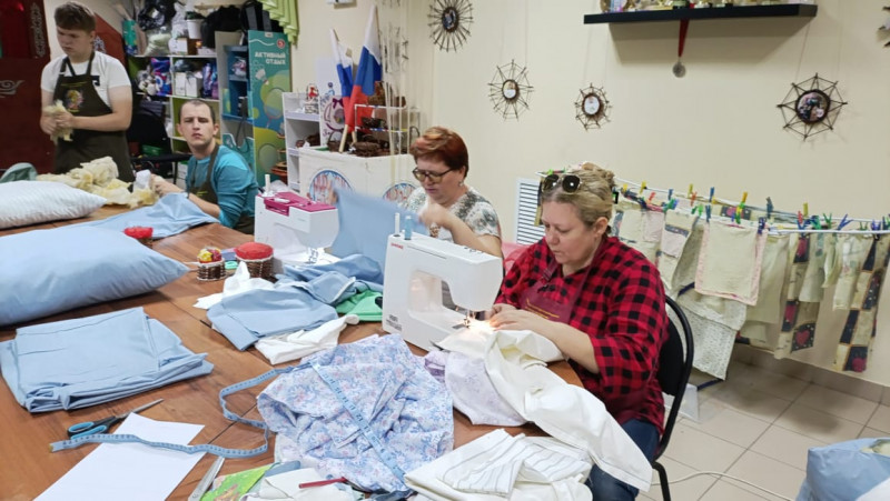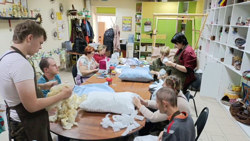 Дети - инвалиды при поддержке взрослых, сделали своими руками подушки и постельное белье для военнослужащих, находящихся на лечении в госпитале и передали сестрам Марфо - Мариинского Сестричества храма Архистратига Михаила п. Каменоломни.