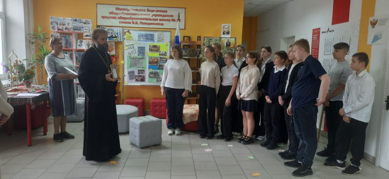 В рамках реализации проекта «Быть нужным» для обучающихся 6а класса МБОУ СОШ №23 п. Красногорняцкий Октябрьского района был проведен тематический час «Теплый свет Покрова». В мероприятии принял участие благочинный приходов Нижнедонского округа протоиерей Сергий Яценко.