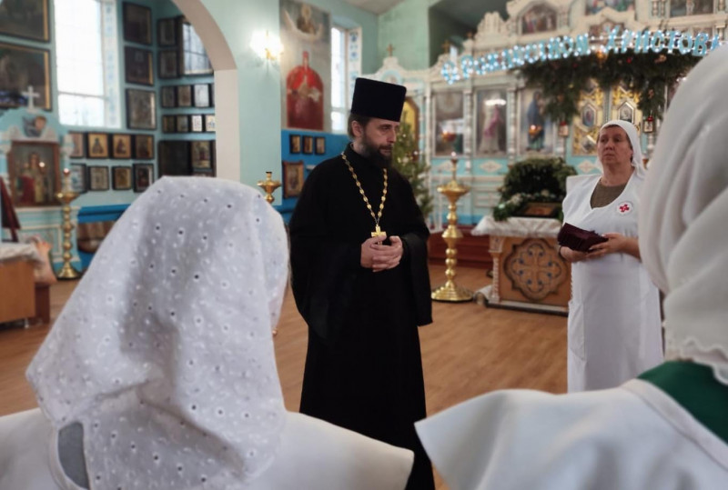 Священник поздравил сестёр с великим праздником и поблагодарил их за их служение. В процессе общения, духовник говорил с сестрами о особенности сестринского служения и его неразрывной связи с правильным устроением духовной жизни: «Главная добродетель сестры милосердия – «милующее сердце», оно не может черпать силы из пустого источника. Господь наполнит сердце милостью, если источник духовных сил искать в литургической молитве и причащении Святых Христовых Таин.