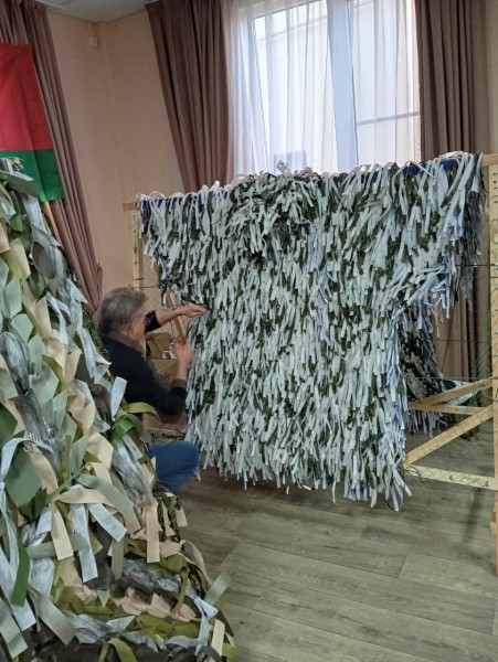Работают волонтёры с тканью разных цветов. Основная гамма должна соответствовать ландшафту, ведь одна местность покрыта снегом, а другая – соломой и травой. По словам самих добровольцев, для того чтобы сделать одну сетку размером 2х3 метра, необходимо не менее 4-х часов.