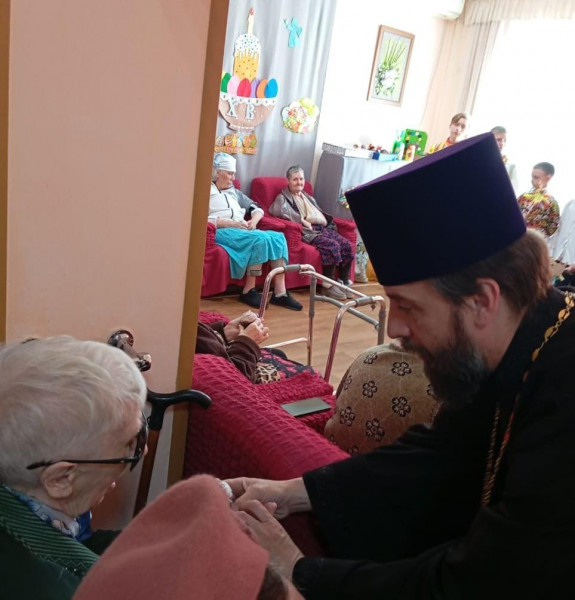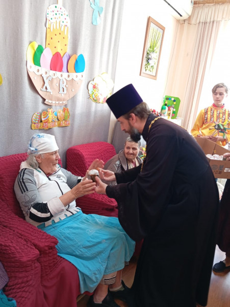 Благочинный приходов Нижнедонского округа протоиерей Сергий Яценко совместно с учащимися церковно-приходской воскресной школы «Благовест» храма Архангела Михаила пос. Каменоломни Октябрьского района в великий праздник Светлого Христова Воскресенья посетили Центр социального обслуживания граждан пожилого возраста и инвалидов.