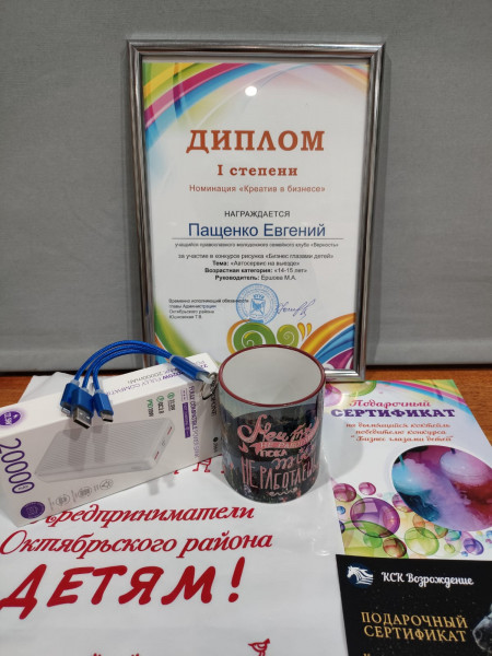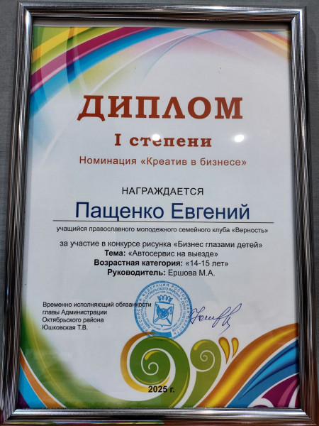 Участник молодежного семейного клуба "Верность" храма Архистратига Михаила п. Каменоломни Пащенко Евгений, за работу «Автосервис на выезде», предоставленную в номинации «Креатив в бизнесе», получил Диплом I степени.