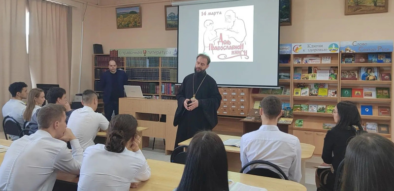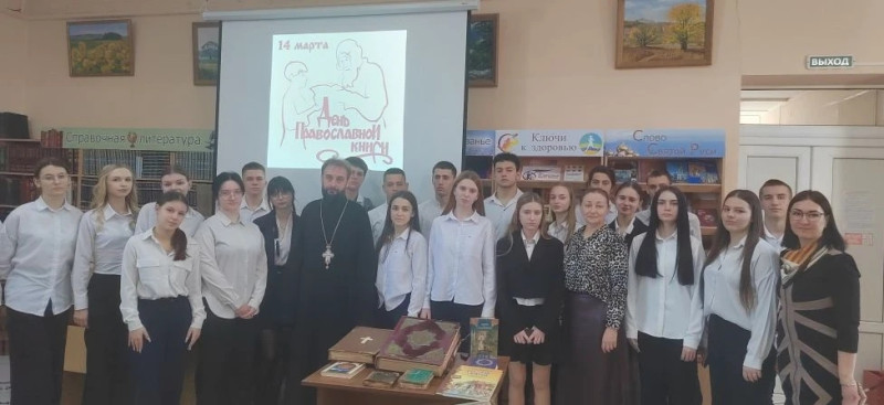 В Центральной районной библиотеке поселка Каменоломни состоялась встреча учащихся старших классов Лицея № 82 им. А. Н. Знаменского с благочинным приходов Нижнедонского округа протоиереем Сергием Яценко. Мероприятие было приурочено к теме, объединяющей историю, культуру и православные традиции, — «Духовные книги — книги о главном».