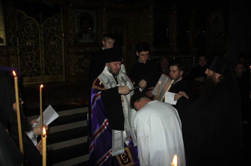 По расстеленной дорожке в храме постригаемый в знак своего смирения и покаяния от западной части, распинаясь, прополз к амвону. Монашеская братия епархии прикрывала постригаемого мантиями, пока тот полз к амвону и потом давал монашеские обеты.