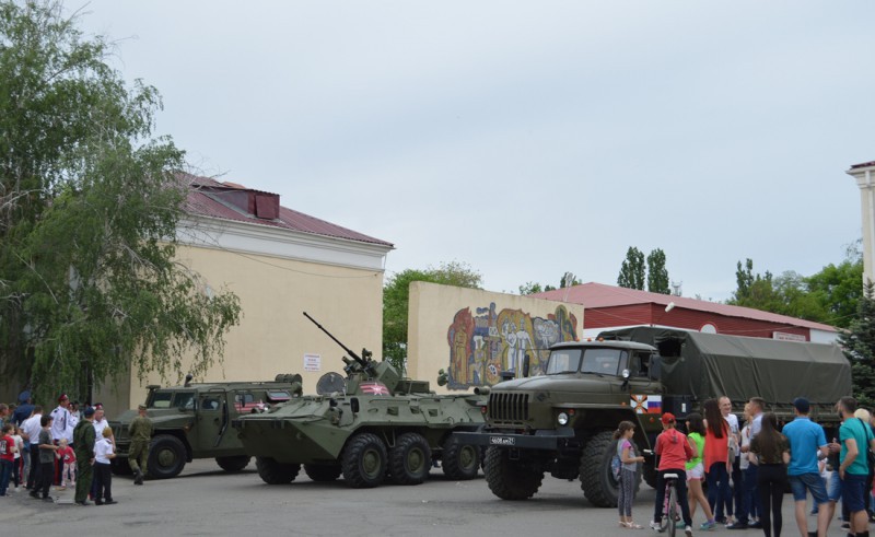 Далее, состоялось прохождение боевой техники. В строю техники бронетранспортеры, состоящие на вооружении сухопутных войск и других силовых ведомств. БТР 82–боевая колёсная плавающая бронемашина, предназначенная для транспортировки личного состава мотострелковых подразделений и их огневой поддержки, в том числе и в условиях применения оружия массового поражения.