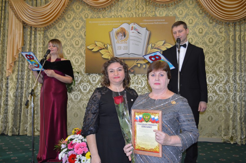 Глава районной Администрации вручила медаль «За доблестный труд на благо Донского края» директору Межпоселенческой центральной библиотеке Т.Ф.Репенко, а так же благодарственные письма работникам библиотек за многолетний добросовестный труд и в связи с празднованием 80-летнего юбилея.