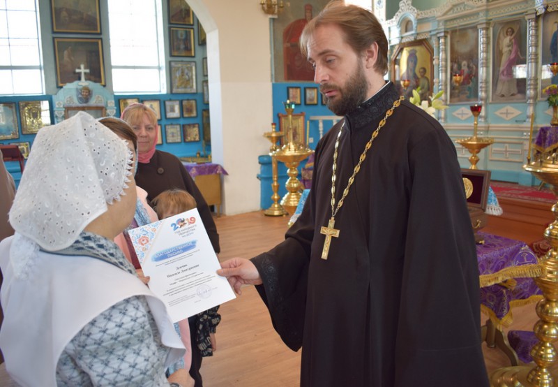 Благочинный приходов Нижнедонского округа протоиерей Сергий Яценко в храме Архангела Михаила п. Каменоломни Октябрьского района вручил сестре Марфо-Мариинского Сестричества Денчик Надежде Благодарственное письмо от районного отдела культуры за активное участие в мероприятиях посвященных открытию Года народного творчества в Октябрьском районе.