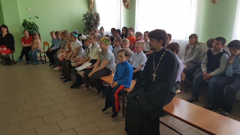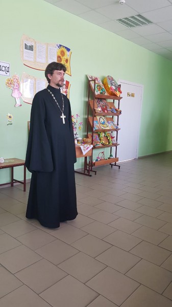Священник поздравил всех учащихся и учителей с праздником Пасхи. В завершение встречи отец Андрей подарил ребятам пасхальные подарки.
