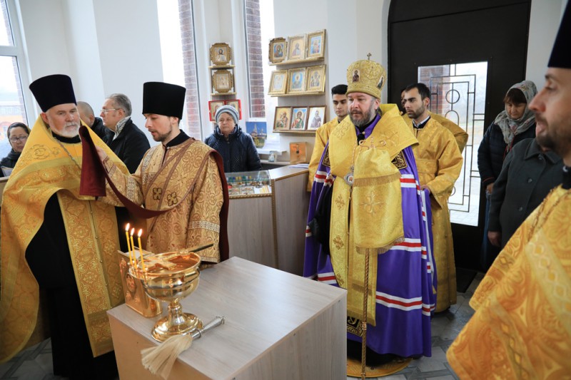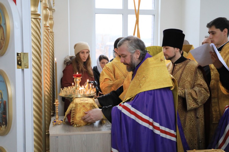 Совершая чин освящения, Владыка Симон окропил святой водой стены храма, святой алтарь и молящихся. Архиерей подписал храмовый антиминс, на котором будет совершаться главное богослужение – Божественная Литургия.