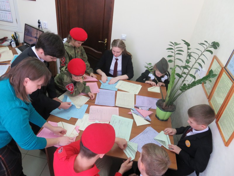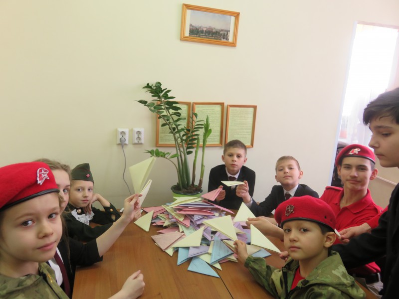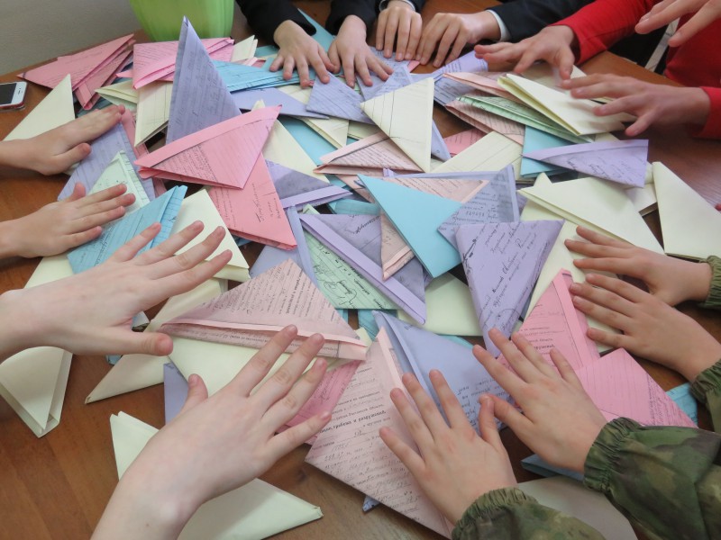 Волонтеры свернули подготовленные копии в виде фронтовых треугольников в помещении читального зала архивного сектора и раздали их, в знак памяти, жителям поселка.